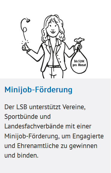 Mit der MINIJOB-FÖRDERUNG (Schwerpunkte: Freiwilligenmanagement oder Kommunikation und Zusammenarbeit) sollen die ehrenamtlichen Strukturen in Vereinen, Sportbünden und Landesfachverbänden durch eine nebenberufliche Unterstützung gestärkt werden. Die Förderung gilt für maximal zwölf Monate.